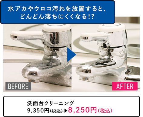 • ●こびりついた化粧品の汚れ、水アカも、しつこい汚れに変わる前にプロに頼んで清潔にリセット!