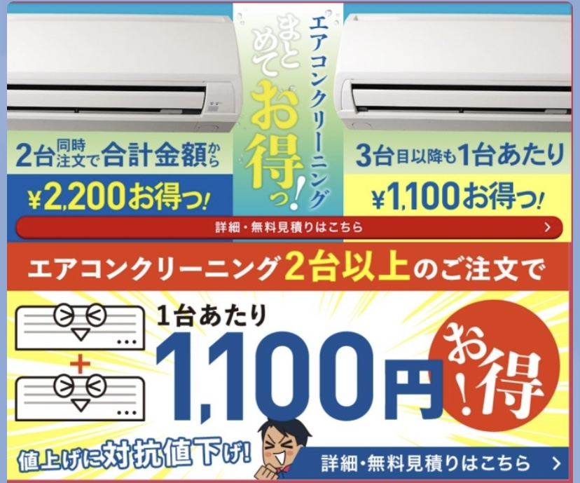 ※ 期間中、エアコンクリーニングを複数台ご注文頂いた場合、1台あたり1,100円引きになります。