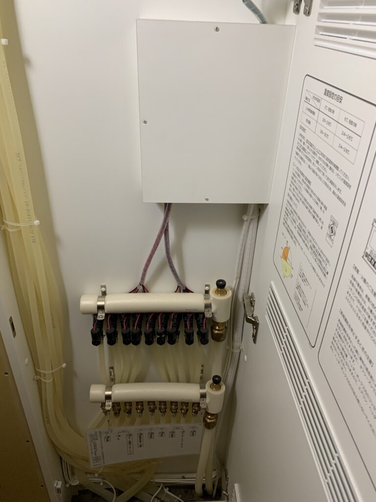 ①お家の何処かに床暖房の集中配管が設置してあるヘッダーボックス(配管が集中しているBOX)がありますので探してください。