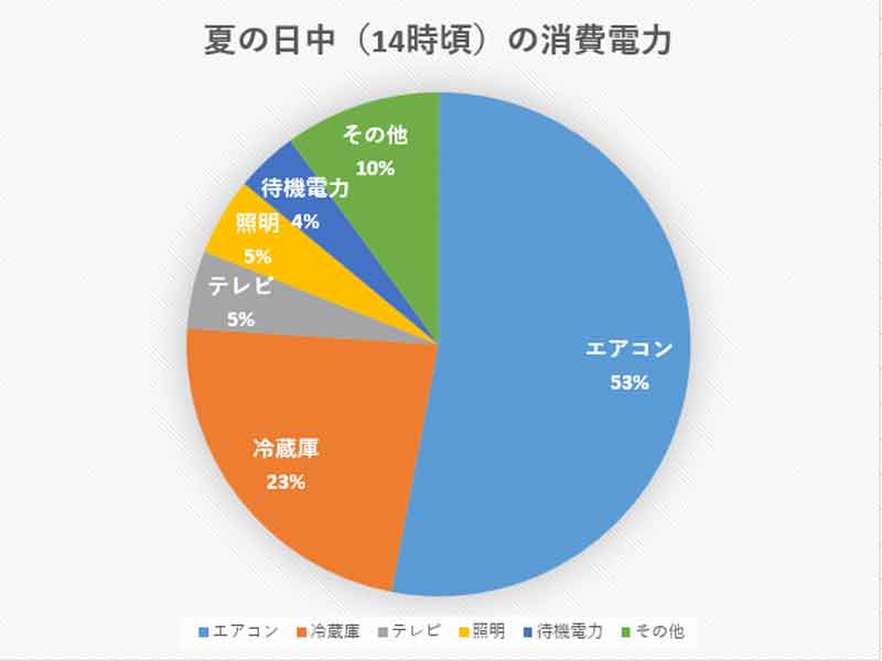 夏の日中(14時頃)のエアコンの消費電力は、その家庭の全消費電力の53%を占めています。